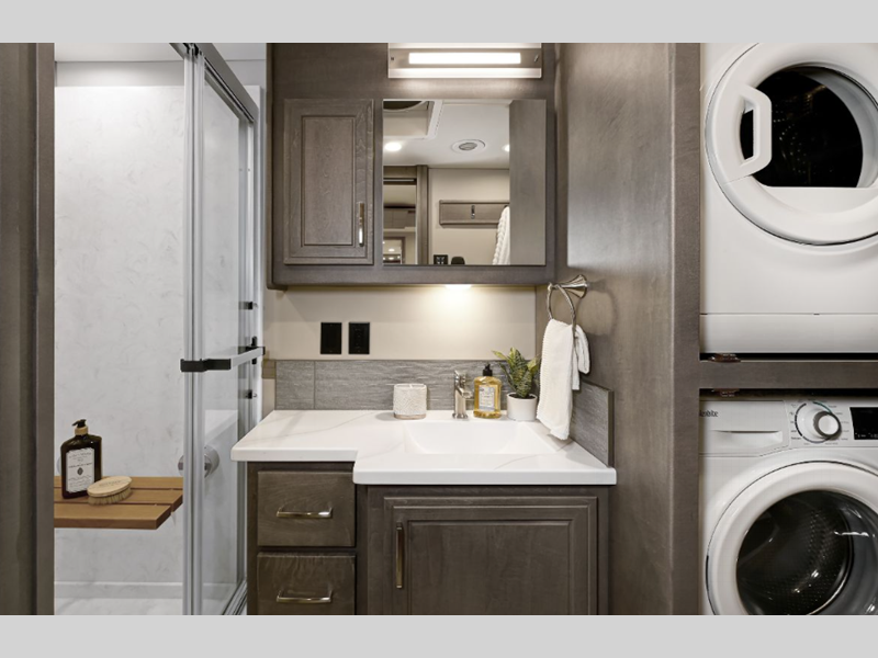 The exterior portion of the Explorer is outfitted with an aerodynamic fiberglass, equalizer fully automatic four-point hydraulic leveling system, and a Diamond Shield anti-chip paint protection to keep your unit looking its best. The multiplex control system comes with Bluetooth app control so you can adjust things at the touch of a finger, and the 8kW Onan QD generator will provide you with power. Plus, you'll have to check out the great list of options that will make your Explorer even more adventure-worthy.