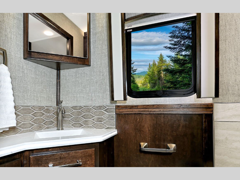Sleeps 7 Slides 3 Length 41 ft Int Height 0 ft 6 in Interior Color Ridgeline, Ascent, Cascade Exterior Color Unpainted White or 4-Tier Paint Personalization Fresh Water Capacity 150 gals Grey Water Capacity 75 gals Black Water Capacity 75 gals Generator 12.5kW Onan Quiet Diesel Fuel Type Diesel Number Of Bunks 1 Available Beds Mini King Refrigerator Type French Door Residential w/Stainless Steel Doors Refrigerator Size 18 cu ft Convection Cooking Yes Cooktop Burners 2 Shower Size 42" x 35" Number of Awnings 1 Water Heater Type Aqua Hot 450D Hydronic TV Info LR 4K Smart LED TV, BR 4K Smart LED TV, Ext. 43" Smart LED TV Awning Info Roof Mounted Girard 2 Stage Lateral Arm w/LED Lights Washer/Dryer Available Yes Shower Type Standard Electrical Service 50 amp Solar Wattage 6000 watts Similar Floorplans