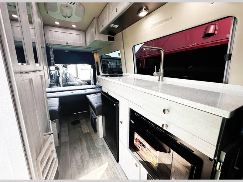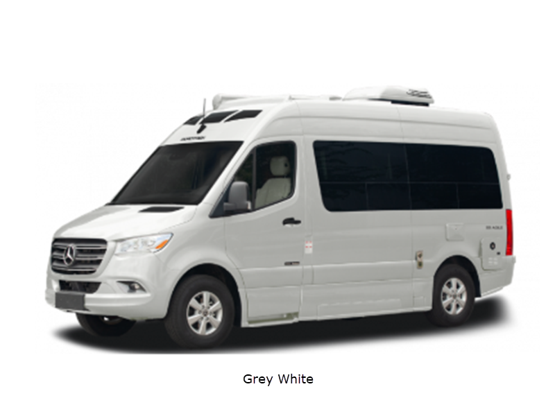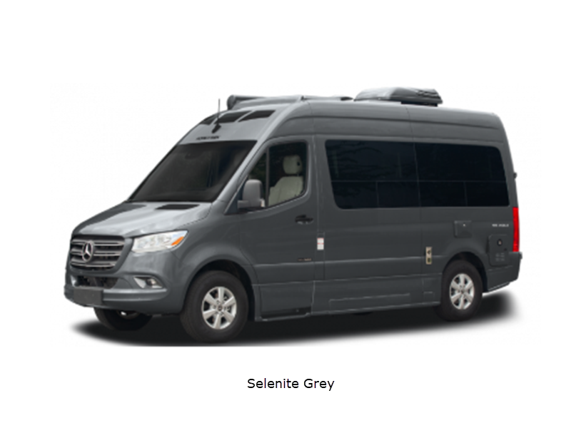 Sleeps 2 Length 19 ft 5 in Ext Width 6 ft 8 in Ext Height 9 ft 7 in Int Height 6 ft 3 in Exterior Color Grey White, Silver Ice, Selenite Grey Hitch Weight 5000 lbs GVWR 9050 lbs Cargo Capacity 1500 lbs Fresh Water Capacity 30 gals Grey Water Capacity 20 gals Black Water Capacity 10 gals Tire Size LT245/75R16E Black Wall Furnace BTU 16000 btu Generator 360W Fuel Type Diesel Engine 3.0L CRD V6 Blue Tec Chassis Mercedes Short Sprinter Horsepower 190 hp Wheelbase 144 in Torque 325 ft-lb Refrigerator Type 12V/110V Refrigerator Size 3.1 cu ft Convection Cooking Yes Cooktop Burners 2 Number of Awnings 1 LP Tank Capacity 16 gals Water Heater Type Tankless 42K BTU AC BTU 11000 btu TV Info Coach 24" Smart TV Awning Info 10' Power Gross Combined Weight 13550 lbs Shower Type Wet/Bath Shower Electrical Service 30 amp Solar Wattage 300 watts