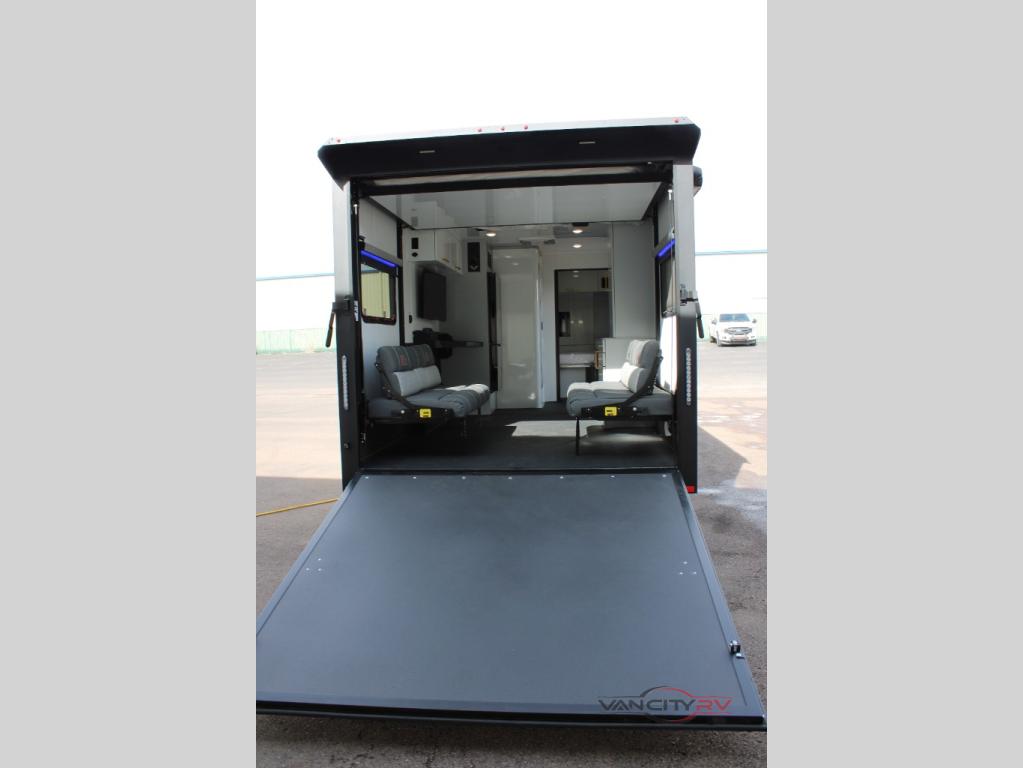 This spacious toy hauler is perfect for your toys, personal belongings, and more! There is 13' 3" total garage space when you utilize the space up to the wet bath, and the eight tie-down rings will keep everything secure. You'll enjoy the front bedroom with a queen bed with memory foam, a MaxxAir vent, and a 32" Smart TV. If you're needing more sleeping space, you can choose to add the optional Happijac queen bed and optional Happijac sofa beds. A full kitchen includes a two burner cooktop and a 10 cu. ft. 12V refrigerator, along with a fold-down removable table for dining space. And if you enjoy cooking outdoors, the optional exterior slide out kitchen can easily be added. The dry weight for this model ranges from 6,000 lbs. - 6,500 lbs., the carrying capacity ranges from 2,000 lbs. - 2,500 lbs., and the tongue weight ranges from 820 lbs. - 1,100 lbs.